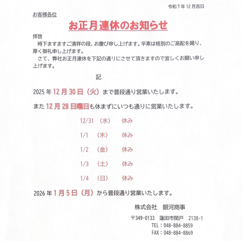 2025年12月26日(金) お正月連休のお知らせ